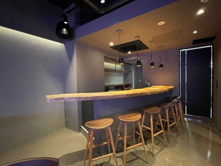 ENTRANCE正面右側に厚み65mmのトチの木のBarCounterがナチュラルな存在感を演出します。